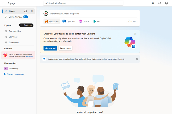 Pre nekoliko godina Microsoft je kreirao Yammer– društvenu mrežu koja za cilj ima umrežavanje i razmenu znanja. Ovo je najviše podsećalo na stare Usenet portale koje su neki od nas koristili 90-tih godina prošlog veka da diskutuju na zadatu temu. Yammer je evoluirao u Engage, on omogućava diskusiju između zaposlenih gde možete da postavite pitanje, kreirate anketu, pohvalite kolegu…
