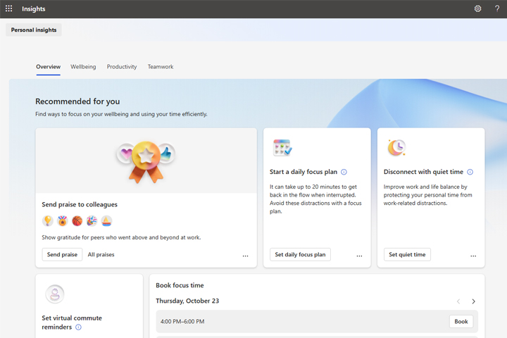 Korišćenjem Viva Insights modula svaki zaposleni može da ima uvid u vreme angažovanja, da odvoji vreme za važne aktivnosti, pauze, vežbe radi smanjivanja stresa, dremku… Prikazuje statistike koliko vremena se provodi u prepiskama, četu, na sastancima… Menadžeri pomoću Viva Insights modula mogu da vide koliko ko radi, da li je preopterećen, a rukovodioci dobijaju agregirani uvid o produktivnosti i dobrobiti kompanije.